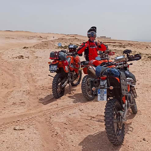 Momo, c’est un sacré pilote sur le goudron. Le mec a eu les couilles de se faire 6 courses sur l’île de Man. Mais Momo c’est le genre à faire des expériences et à jamais se contenter de maîtriser ce qu’il maitrise. Alors, il a voulu découvrir cette surface étrange : le tout-terrain. Et il a commencé par le Rallye Raid de l’Amitié, un choix par hasard totalement réfléchi !