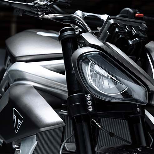 On pourrait presque la confondre avec une Street Triple, la faute à ce phare avant et à une équipe d’Hinckley qui voulait préserver l’identité visuelle de Triumph. Pourtant, ne vous y trompez pas, les Anglais souhaitent faire la révolution. La moto part d’une feuille blanche pour ne pas se laisser « polluer » par des concepts qu’un modèle basé sur le thermique pourrait leur imposer. L’objectif est d’avoir le champ libre pour innover et repenser la moto.