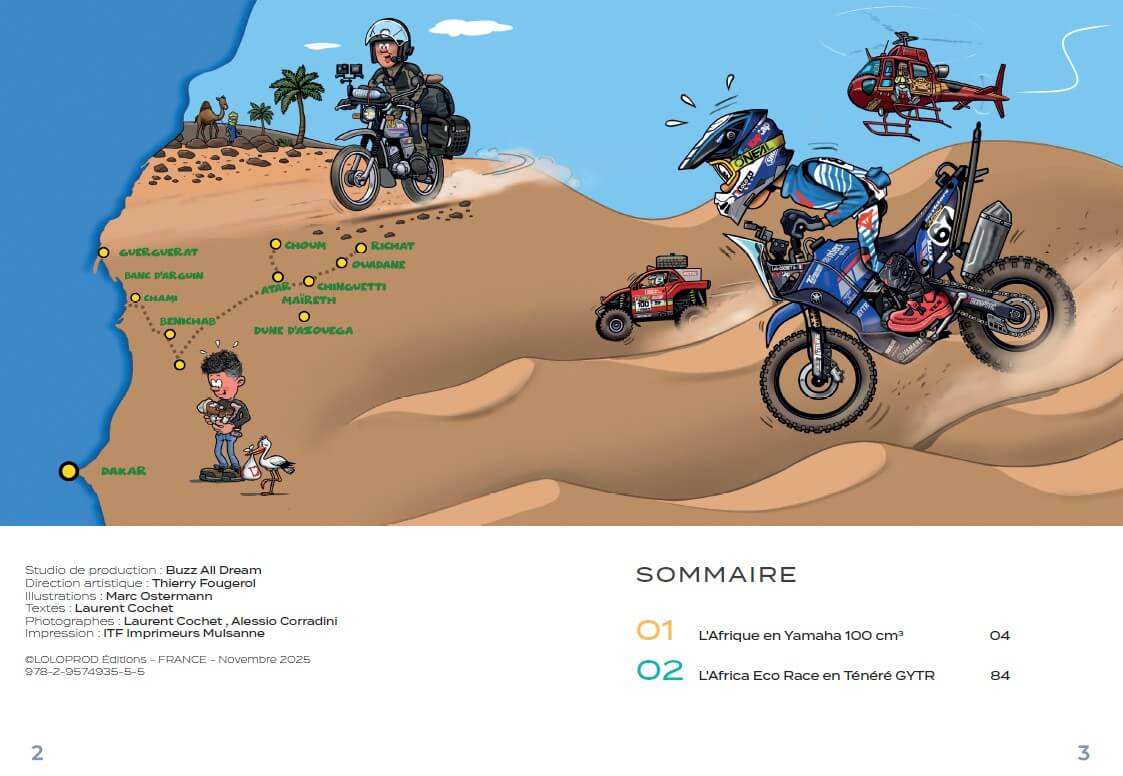 Commandez le nouveau livre moto des aventures de Lolo Cochet à moto.« C’est parti pour le tome 5 de mes aventures et voyage à moto avec cet opus somptueusement illustré par Marc Ostermann. Une éloge à la lenteur au guidon de ma Yamaha AG 100 mais également à la vitesse grâce à une immersion totale au coeur du Team usine Yamaha lors de l’Africa Eco Race 2025. »