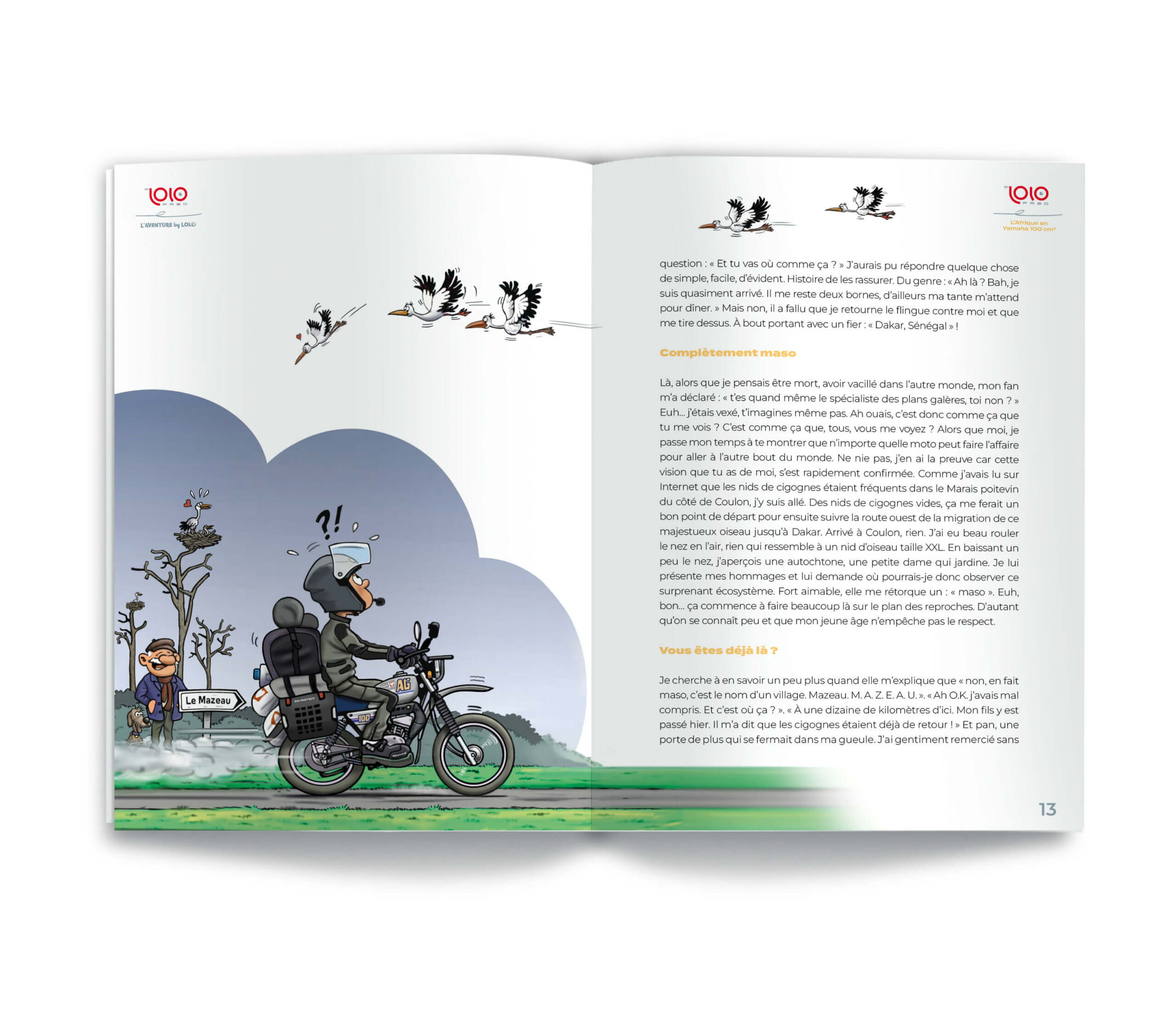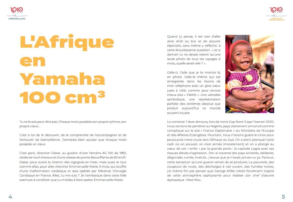 Le tout nouveau livre de voyage moto illustré de Laurent Cochet « l’aventure by Lolo » – C’est parti, direction Dakar, au guidon d’une Yamaha AG 100 de 1993, dotée de neuf chevaux et d’une vitesse de pointe ébouriffante de 92 km. Dakar, pour suivre le chemin des cigognes en hiver, mais aussi et tout comme elles, pour aller chercher Marie-Emmanuelle, 5 mois, qui souffre d’une malformation cardiaque et sera opérée par Mécénat Chirurgie Cardiaque en France. Allez tu me suis ? Je t’embarque dans cette folle aventure. Petit extrait: « La puissance brute Le monstre était en approche. Deux phares perçants, éblouissants, menaçants. Il m’est passé à un mètre, avec la puissance et la force d’un super tanker. Là, le chauffeur du camion s’est affolé et m’a dit de me grouiller à monter dans la benne. J’ai pris mon sac vidéo, mon casque, j’ai sauté maladroitement à l’arrière de la benne en faisant tomber mon iPhone parce que je tentais de filmer tout ça et on a démarré en trombe. On devait rattraper la tête du train qui avait un peu de mal à s’arrêter. Tu m’étonnes, avec ses 2,5 kilomètres de long, ses 250 wagons, ses 17 000 tonnes, pas simple d’être précis sur le repère de freinage. À l’assaut Le camion a fait de nombreuses embardées à ras du train, on aurait cru l’attaque d’une diligence. Comme j’étais à cheval sur une ridelle à l’arrière, un type m’a fait signe de ranger ma jambe pour ne pas me la faire découper en rondelles par le train. D’un coup, la folle cavalcade s’est arrêtée à trois centimètres d’un wagon. Les types à l’arrière du camion ont bondi dans ce wagon et se sont mis à charger tout le poisson qui commençait à empester un peu. Puis est venu le tour de mon Tagazou. Ils l’ont hissé à hauteur supérieure du wagon et l’ont fait basculer, tête en bas, avant de le reposer à nouveau sur ses jantes. Son premier (et j’espère dernier) looping. »