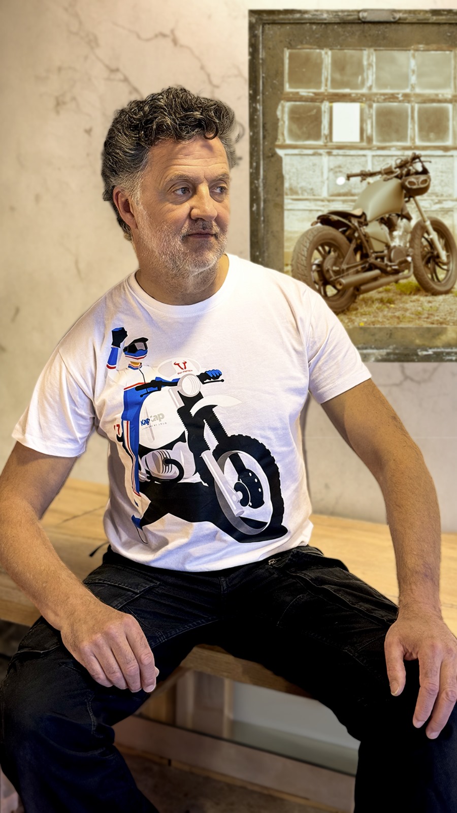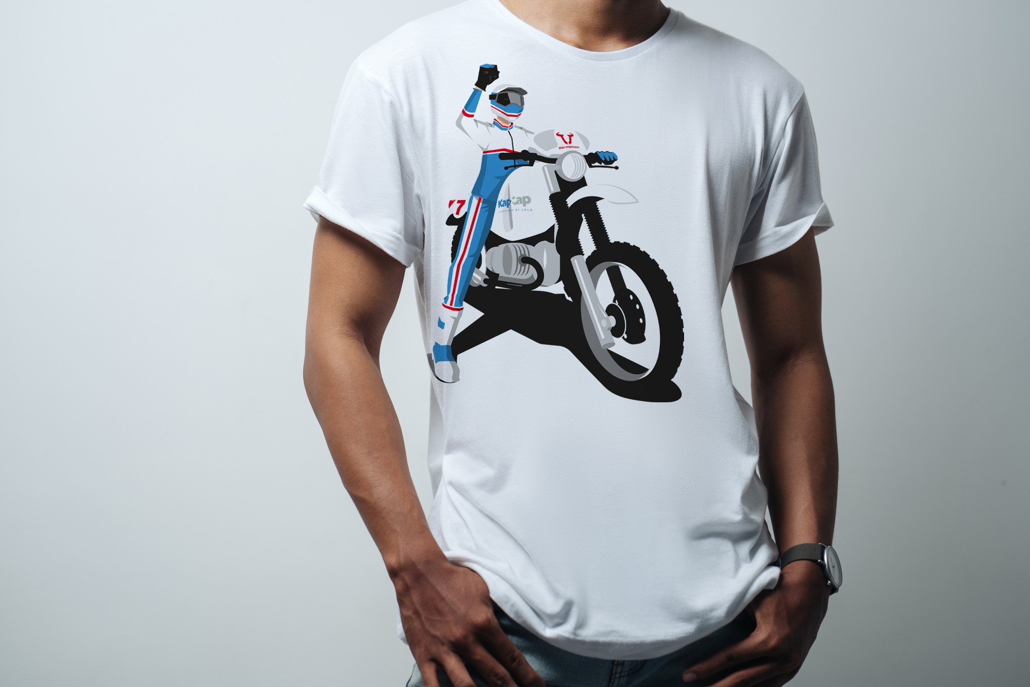 T shirt iconique moto « Rally Raid » années 80 imprimée en DTF sur le torse et logo Kap2Cap imprimé en DTF sur le dos / manches montées / col en côte / jersey simple